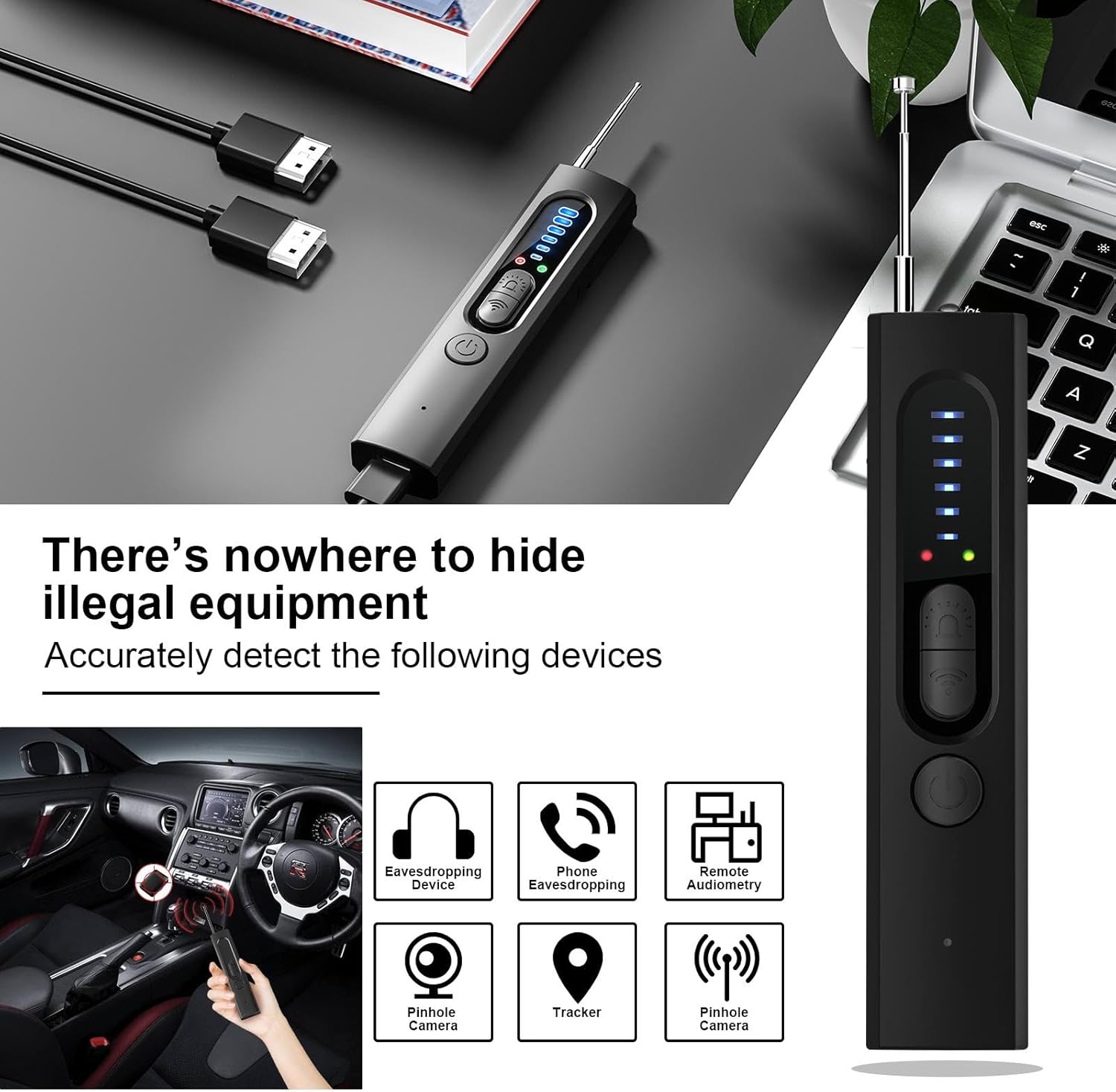 [Multi-function Signal Detector] 1. Pinhole Camera detector detects the camera with an infrared laser and makes use of a special filter attached to the device for observation. 2. GPS Magnetic field detection to search A signal actively emitted by the GPS tracker. 3. Detection of radio waves with 5-Levels sensitivity to detect camera eavesdroppers. [Comprehensive Privacy Protection] Designed to target vulnerabilities in the market, such as bugs, car trackers, cell phone spy software, pinhole cameras, surveillance cameras, casino fraud, and cheating devices. This device fulfills the investigative needs of military and law enforcement agencies, ensuring utmost privacy and security. [Effective Electromagnetic Radiation Detection] Our detector utilizes a digital reception method, receiving frequency range is 1MHz- 6.5GHz, effectively eliminating signal interference from common household devices. In order to find the emission source accurately and quickly, the detector is set up with 5 levels of sensitivity. [Convenient and User-Friendly] Weighing only 30 grams, the Stealth Camera Detector will not weigh you down. With its efficient design, our detector provides a simple and hassle-free experience. It has two types of alarms, silent and vibration, which can meet your different usage environments. [Reliable Customer Support] We value our customers and stand by the quality of our products. If you have any questions or concerns, our friendly and knowledgeable customer support team is ready to assist you.